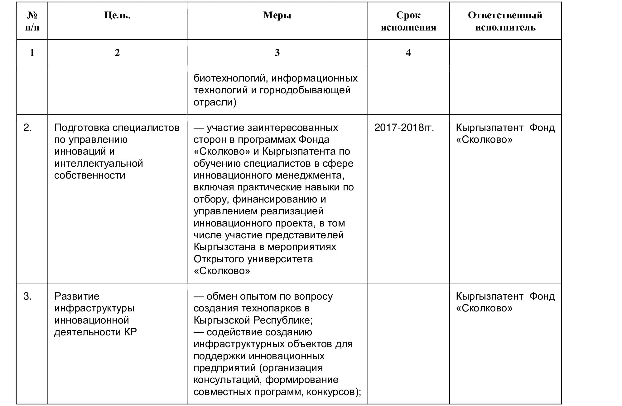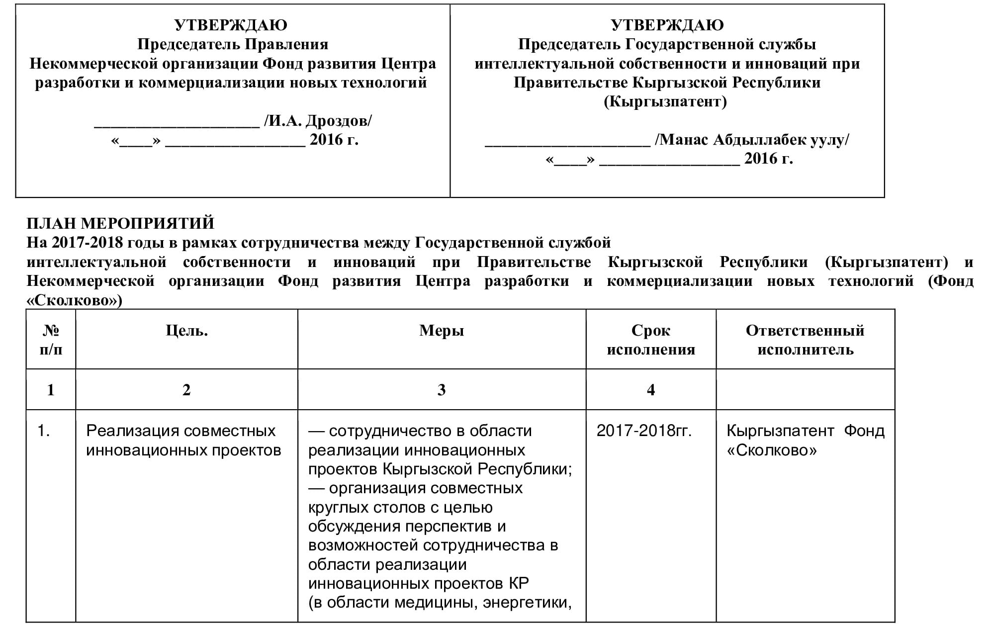Государственная служба интеллектуальной собственности и инноваций при Правительстве Кыргызской Республики и Некоммерческая организация Фонд развития Центра разработки и коммерциализации новых технологий (Фонд «Сколково»), именуемые в дальнейшем «Сторонами»,