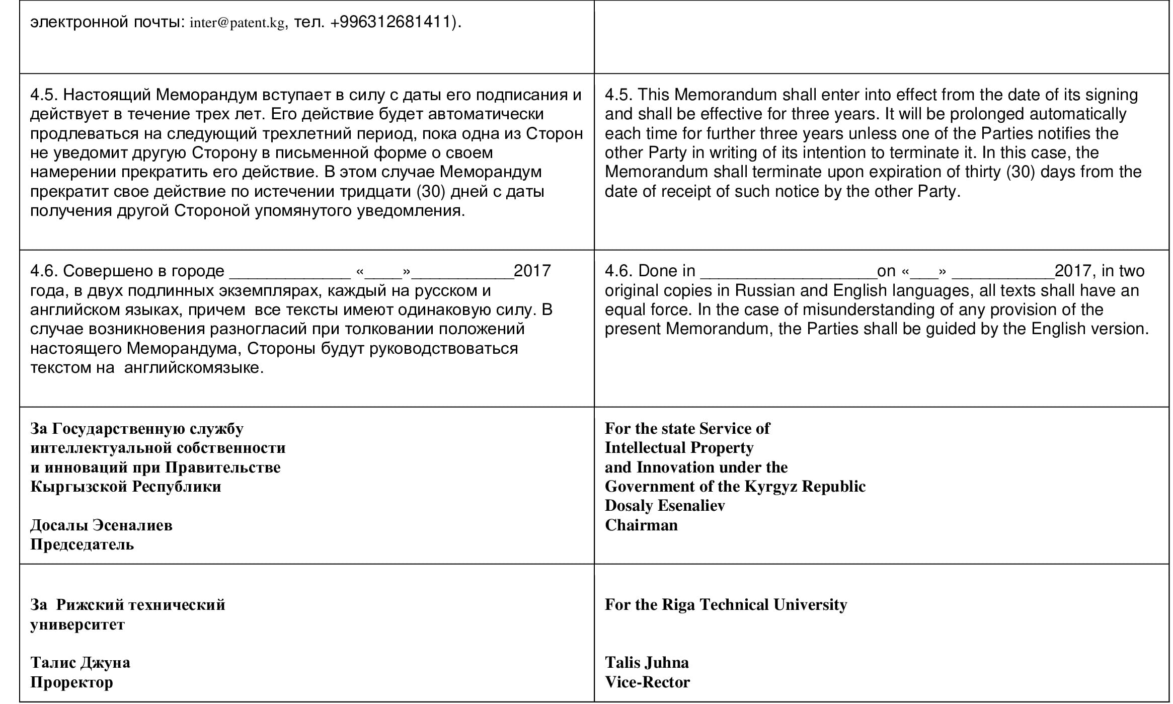 Государственная служба интеллектуальной собственности и инноваций при Правительстве Кыргызской Республики (далее-Кыргызпатент) и Эстонский кластер наукоемкого бизнеса Эстонской Республики, далее именуемые «Стороны»,