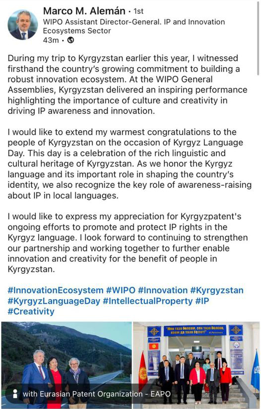 Марко Алеман, заместитель генерального директора Всемирной организации интеллектуальной собственности, поздравил кыргызский народ и коллектив Кыргызпатента с Днем государственного языка Кыргызской Республики. Об этом он написал на своей странице в соц сетях.