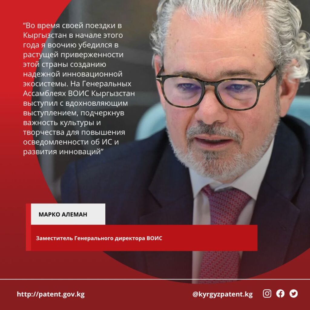 “Во время своей поездки в Кыргызстан в начале этого года я воочию убедился в растущей приверженности этой страны созданию надежной инновационной экосистемы. На Генеральных Ассамблеях ВОИС Кыргызстан выступил с вдохновляющим выступлением, подчеркнув важность культуры и творчества для повышения осведомленности об ИС и развития инноваций.